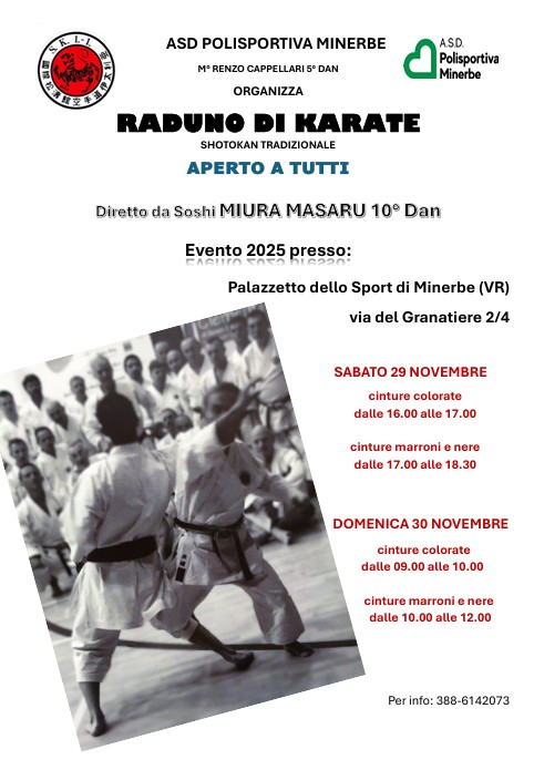 RADUNO DI KARATE29/11/2025 - 30/11/2025 CONFERMATOData apertura iscrizioni : 13/11/2025 - Termine iscrizioni : 30/11/2025 Tipo di evento : Nazionale Diretto da SOSHI MIURA MASARU 10° DANMINERBE (VR)