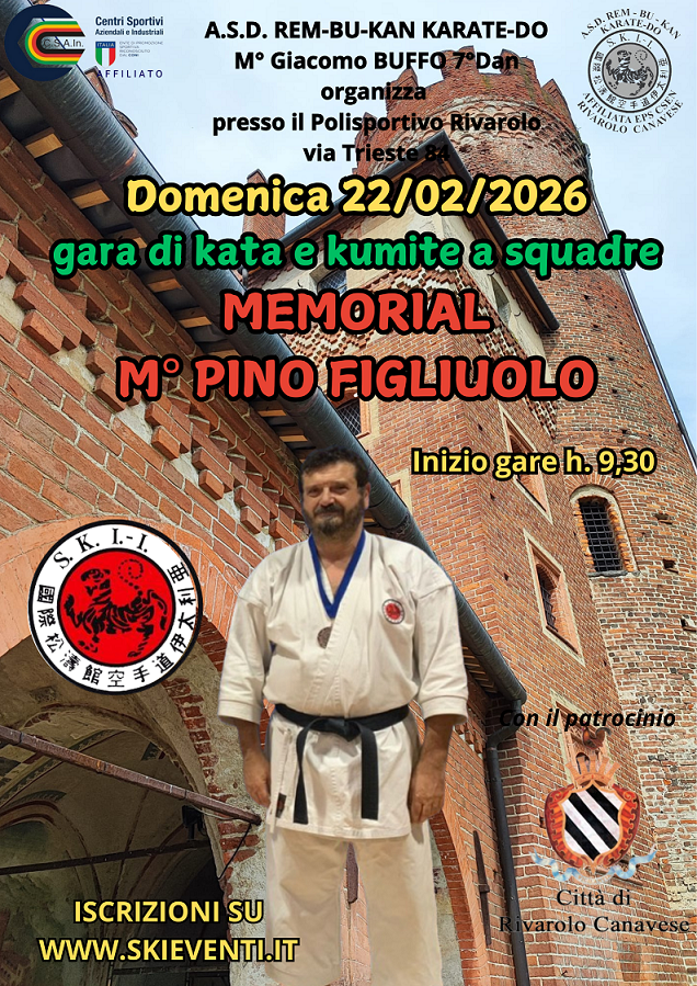 MEMORIAL PINO FIGLIUOLO22/02/2026 CONFERMATOData apertura iscrizioni : 01/01/2026 - Termine iscrizioni : 16/02/2026 Tipo di evento : InterRegionale KATA E KUMITE A SQUADRE===>>>>EVENTO INTERREGIONALE<<<===RIVAROLO CANAVESE