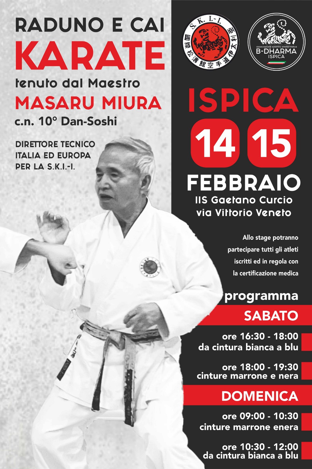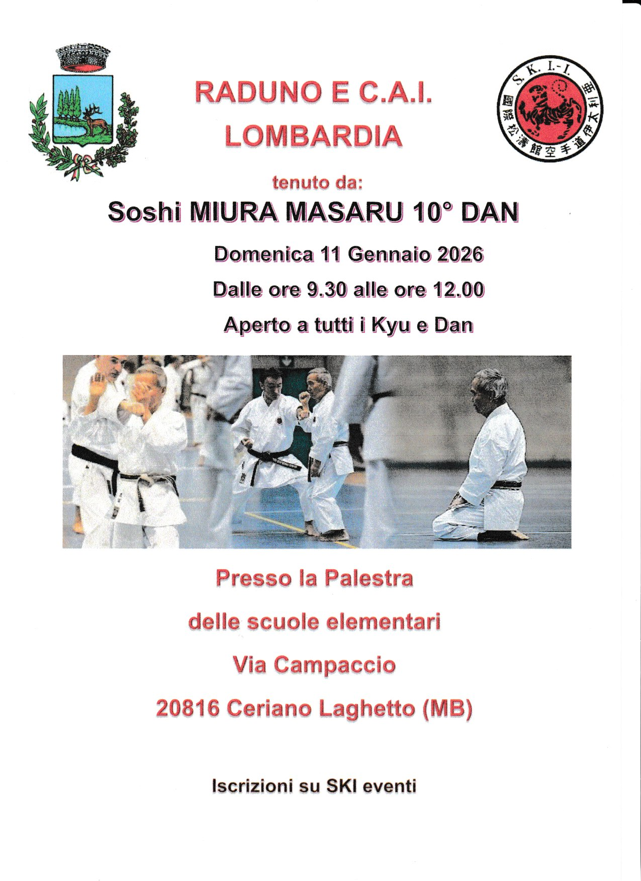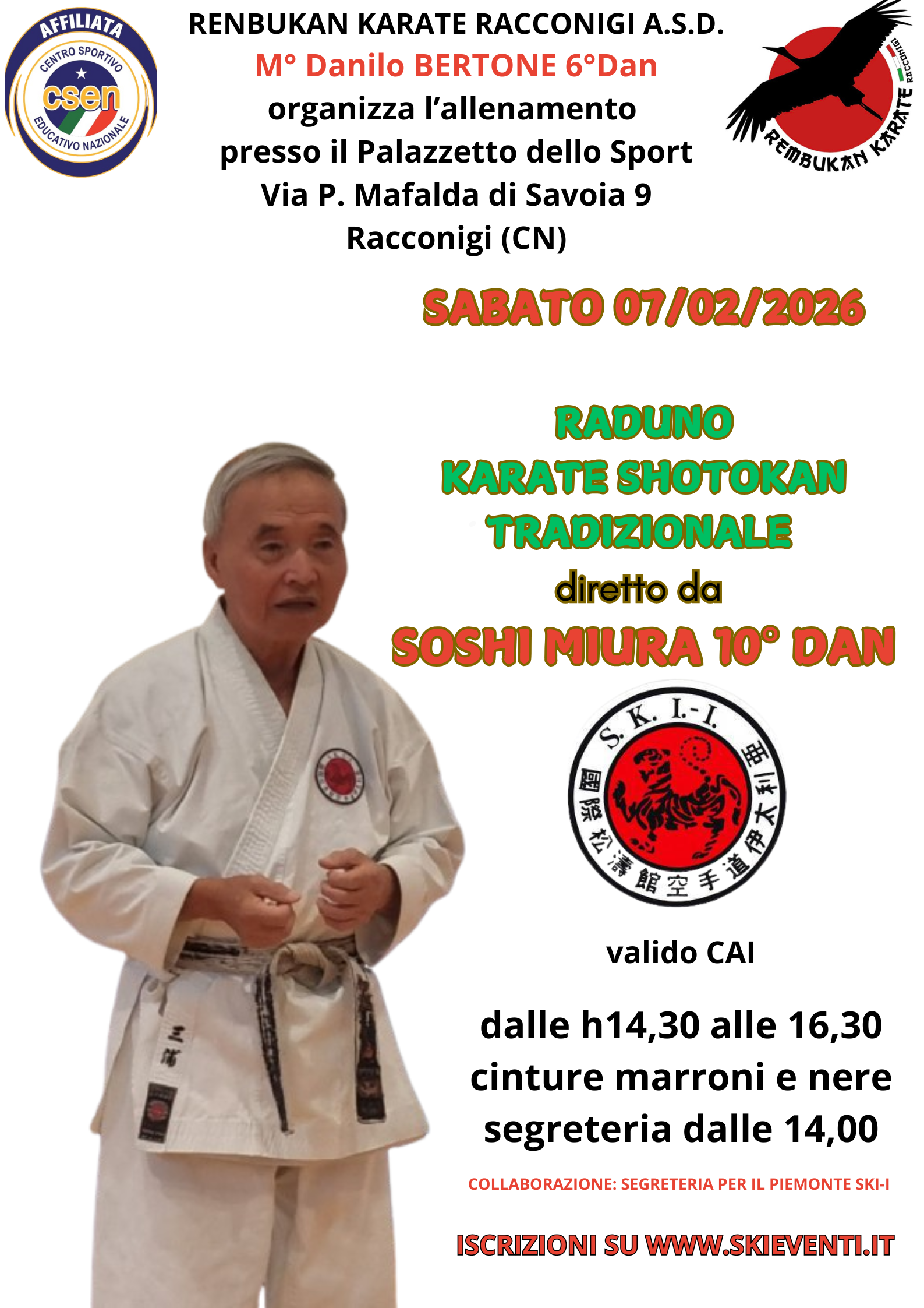 RADUNO KARATE SOSHI MIURA 10 DAN07/02/2026 CONFERMATOData apertura iscrizioni : 07/01/2026 - Termine iscrizioni : 05/02/2026 Tipo di evento : Locale PER CINTURE MARRONI E NERERACCONIGI