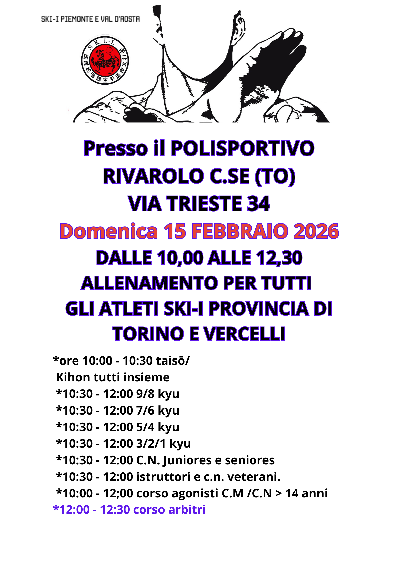 ALLENAMENTO PROVINCE TORINO E VERCELLI15/02/2026 CONFERMATOData apertura iscrizioni : 25/11/2025 - Termine iscrizioni : 13/02/2026 Tipo di evento : Provinciale PER TUTTI I GRADI KYU E DANRIVAROLO CANAVESE