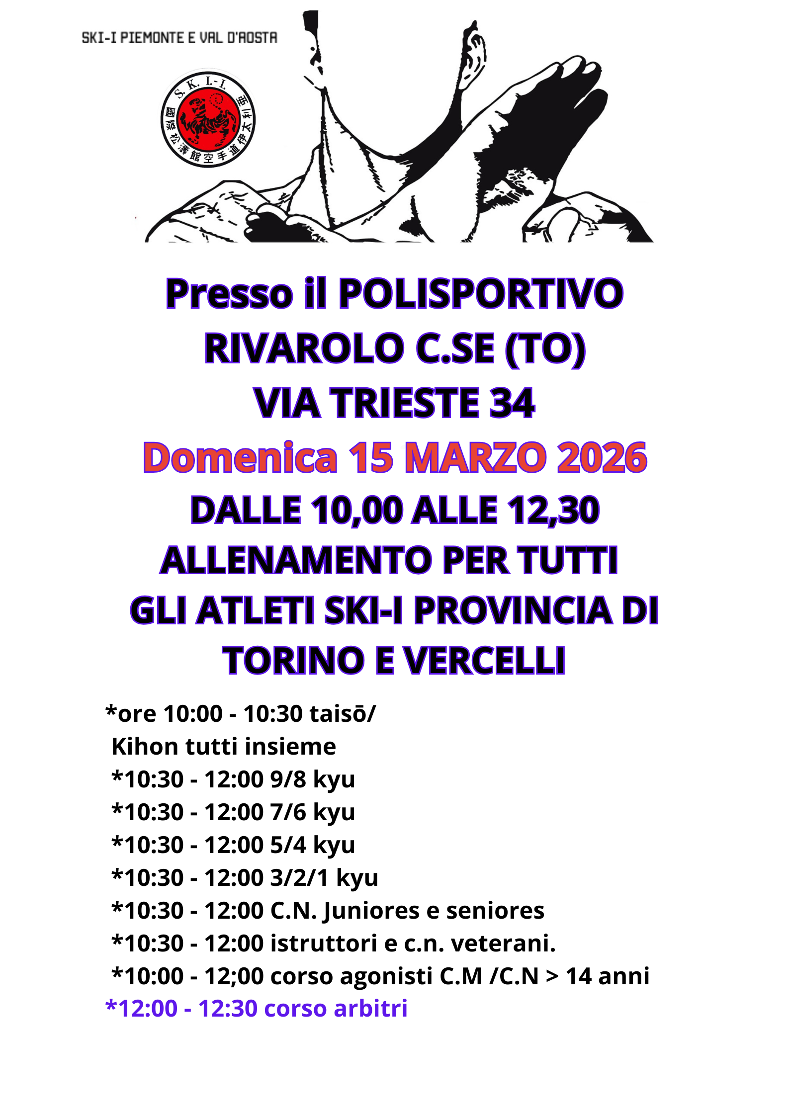 ALLENAMENTO PROVINCE TORINO E VERCELLI15/03/2026 CONFERMATOData apertura iscrizioni : 25/11/2025 - Termine iscrizioni : 13/03/2026 Tipo di evento : Provinciale PER TUTTI I GRADI KYU E DANRIVAROLO CANAVESE