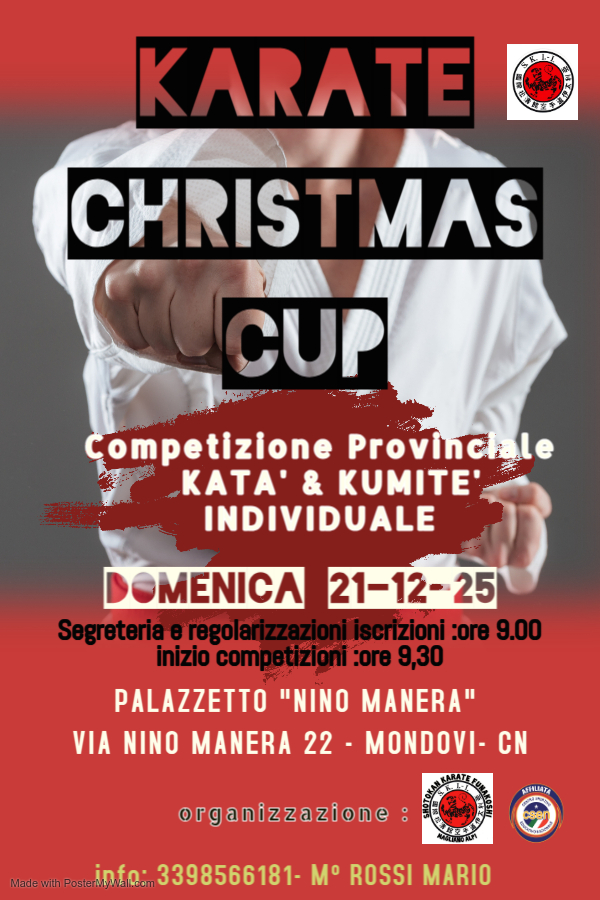 KARATE CHRISTMAS CUP21/12/2025 CONFERMATOData apertura iscrizioni : 26/11/2025 - Termine iscrizioni : 15/12/2025 Tipo di evento : Provinciale COMPETIZIONE PROVINCIALE KATA e KUMITE INDIVIDUALEMONDOVI' (CN)
